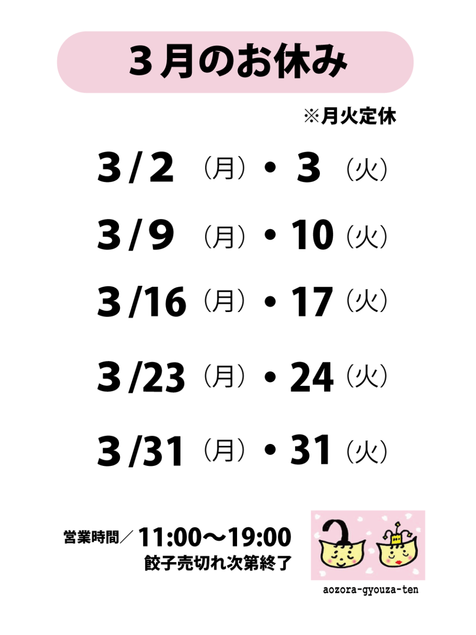 Home › お店からのお知らせ › 今月のお休み › 2026年3月のお休み 2026-02-25 2026年3月のお休み 3月も月・火定休日のみのお休みです。雪解けが進んで道も悪くなりますので、足元にご注意してお越しくださいね! 関連記事 2018年8月のお休み 2025年6月のお休み 2024年1月のお休み 2023年8月のお休み 2019年12月のお休み 2026年2月のお休み